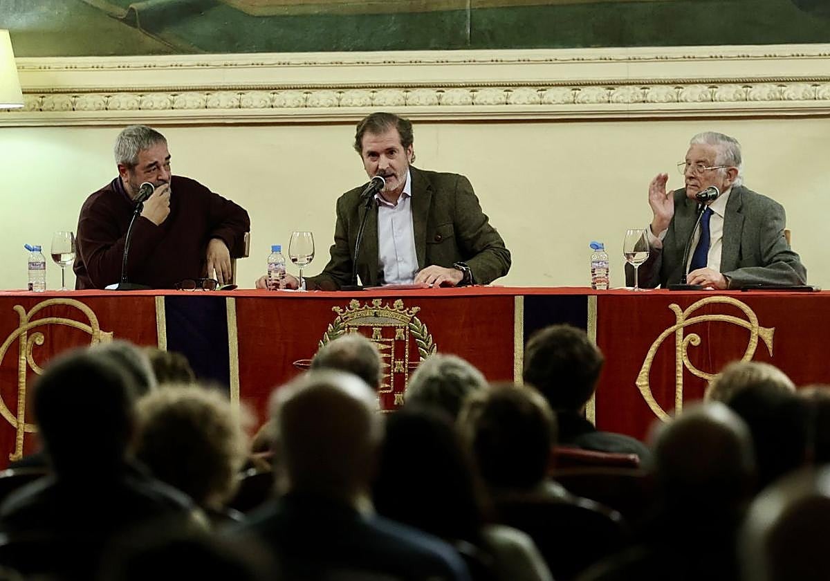 Carlos Aganzo (i) y Emilio Quintanilla (d) flanquean a Fernando Conde en la presentación de su primer poemario.